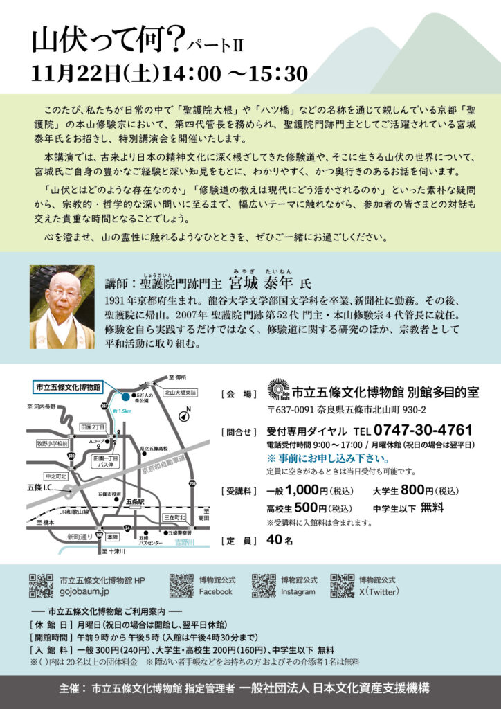 本講演では、古来より日本の精神文化に深く根ざしてきた修験道や、そこに生きる山伏の世界について、宮城氏ご自身の豊かなご経験と深い知見をもとに、わかりやすく、かつ奥行きのあるお話を伺います。