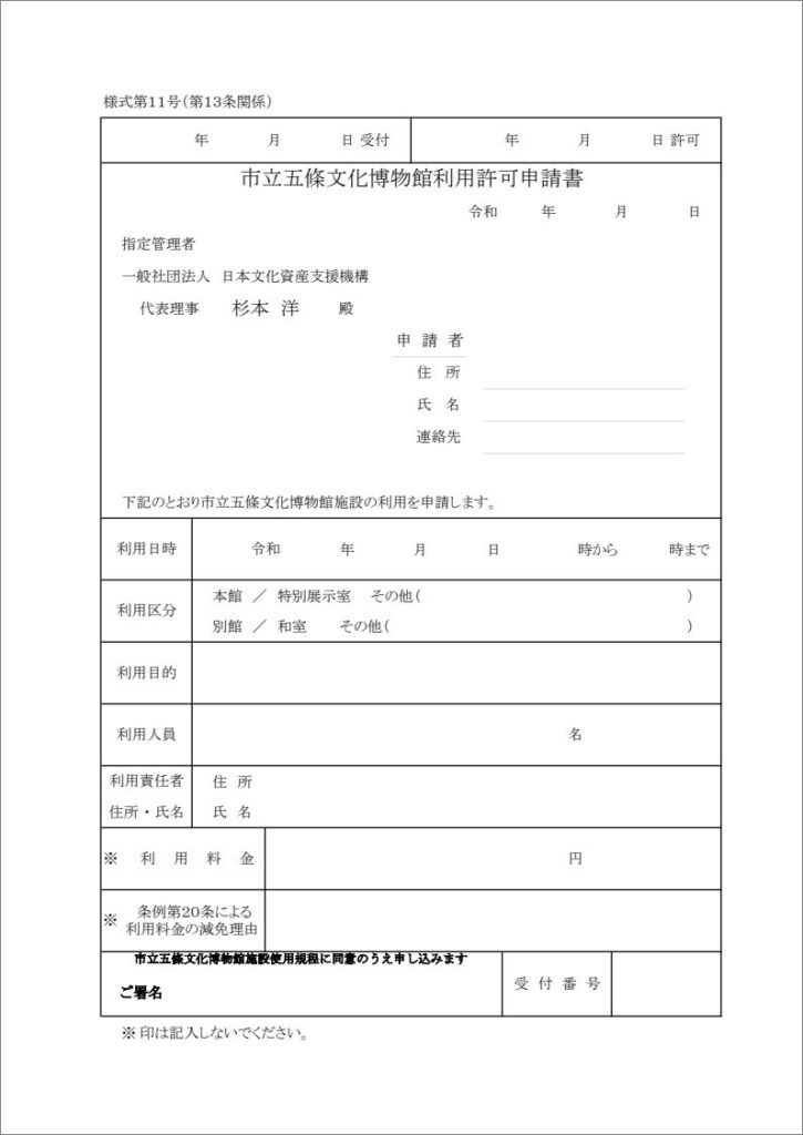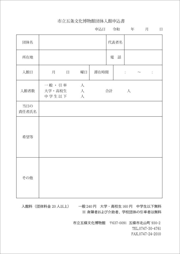 市立五條文化博物館(本館・分館)の各種申請様式をダウンロードすることができます。